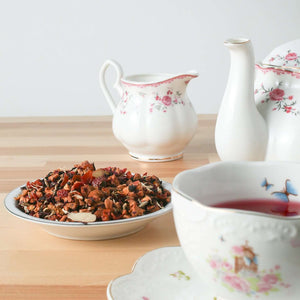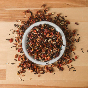 A signature blend at The Tea House, we combine fresh cinnamon, almonds, rooibos and hibiscus. Then blend in vanilla and spiced apple to give this tea a warm and inviting aroma and taste. A definite favorite during the cooler months of the year.