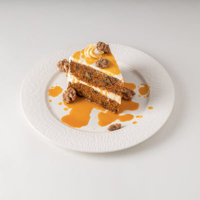 Rich carrot cake with a decadent cream cheese frosting, topped with candied walnuts and a sweet carrot caramel sauce.